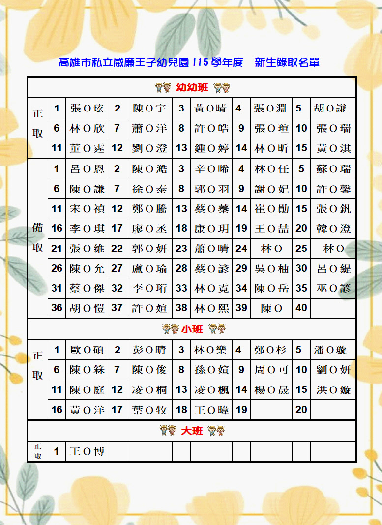 威廉王子幼兒園115學年度新生抽籤錄取名單公告: